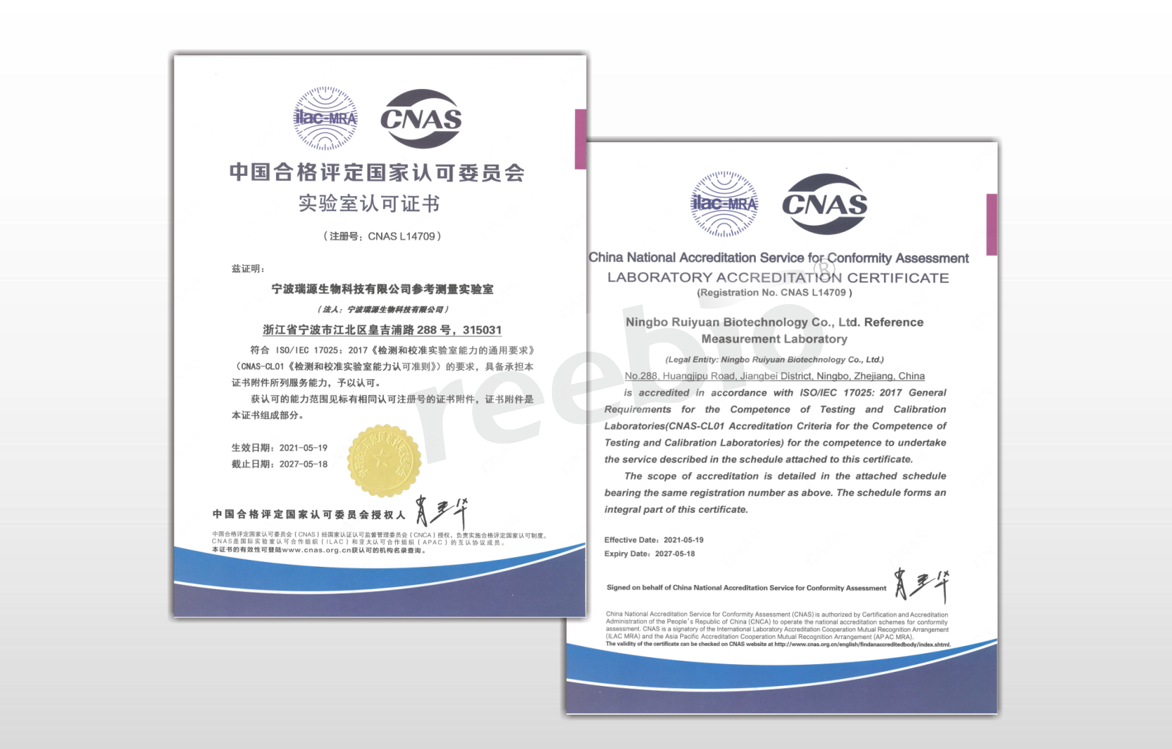 2021年5月19日寧波瑞源生物科技有限公司參考測量實驗室(以下簡稱瑞源生物參考測量實驗室)獲得中國合格評定國家認可委員會(CNAS)頒發(fā)的實驗室認可證書。
